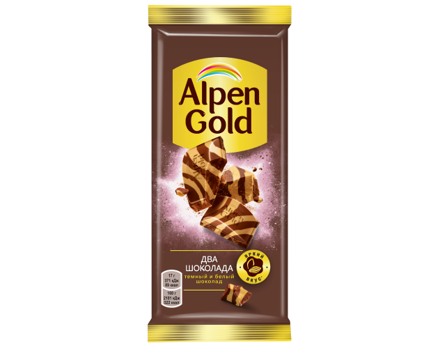 В шоколаде Alpen Gold из темного и белого шоколада гармонично сочетаются молочная нежность белого